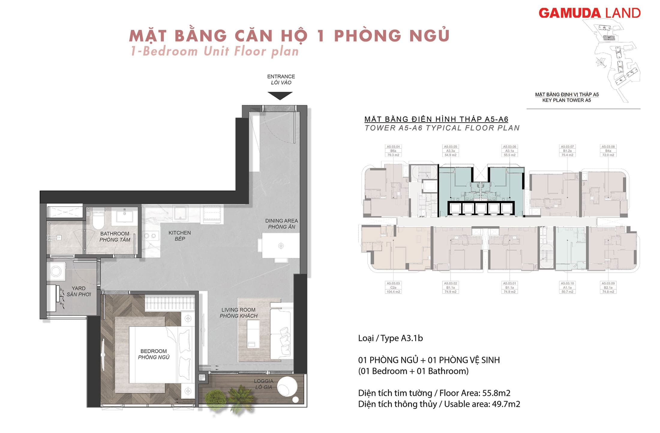 Layout thiết kế căn hộ 1 phòng ngủ loại A3.1b tòa tháp A5 dự án The Ambience Lê Chân.