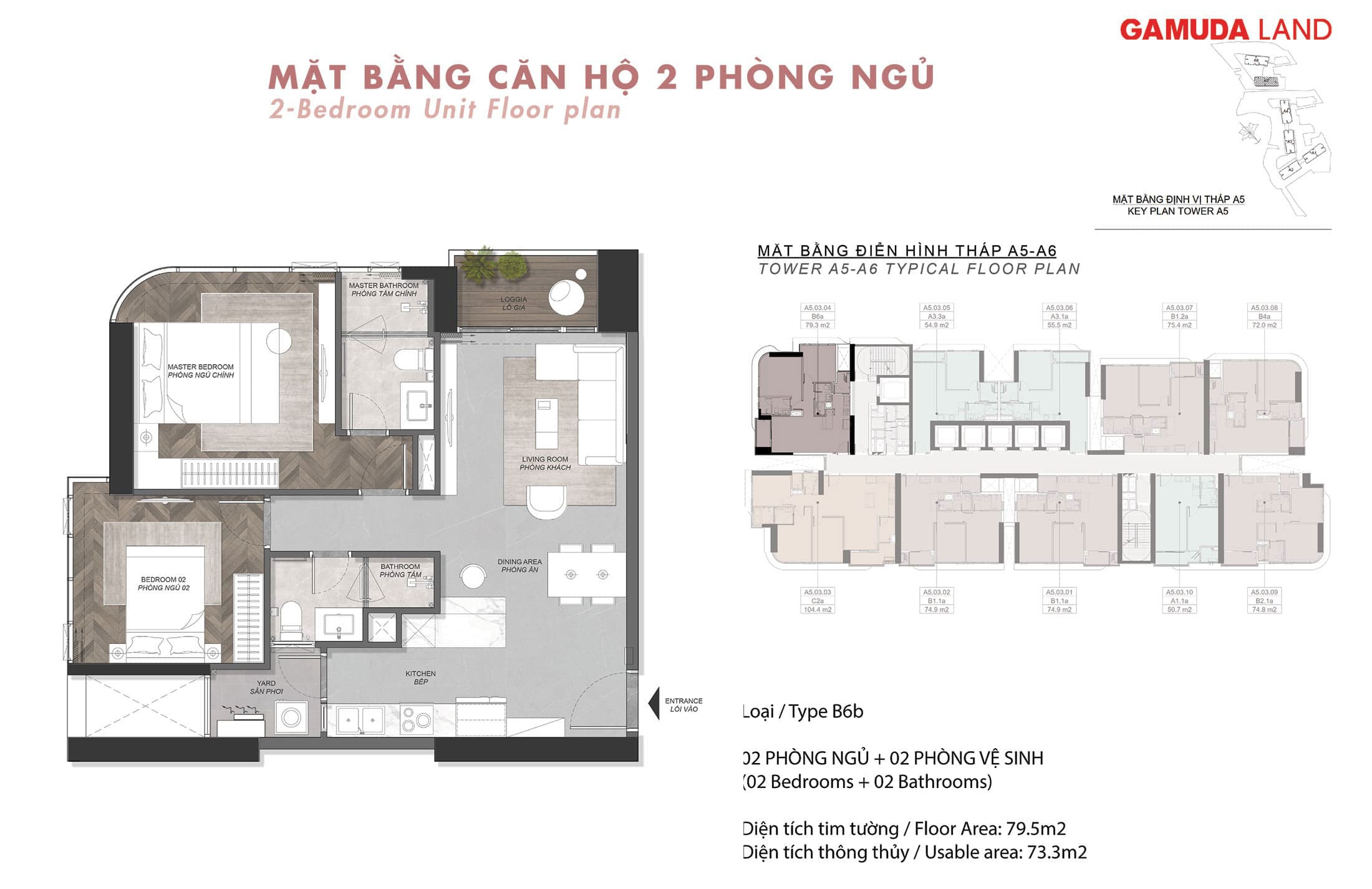 Layout thiết kế căn hộ 2 phòng ngủ loại B6b tòa tháp A5 dự án The Ambience Lê Chân.