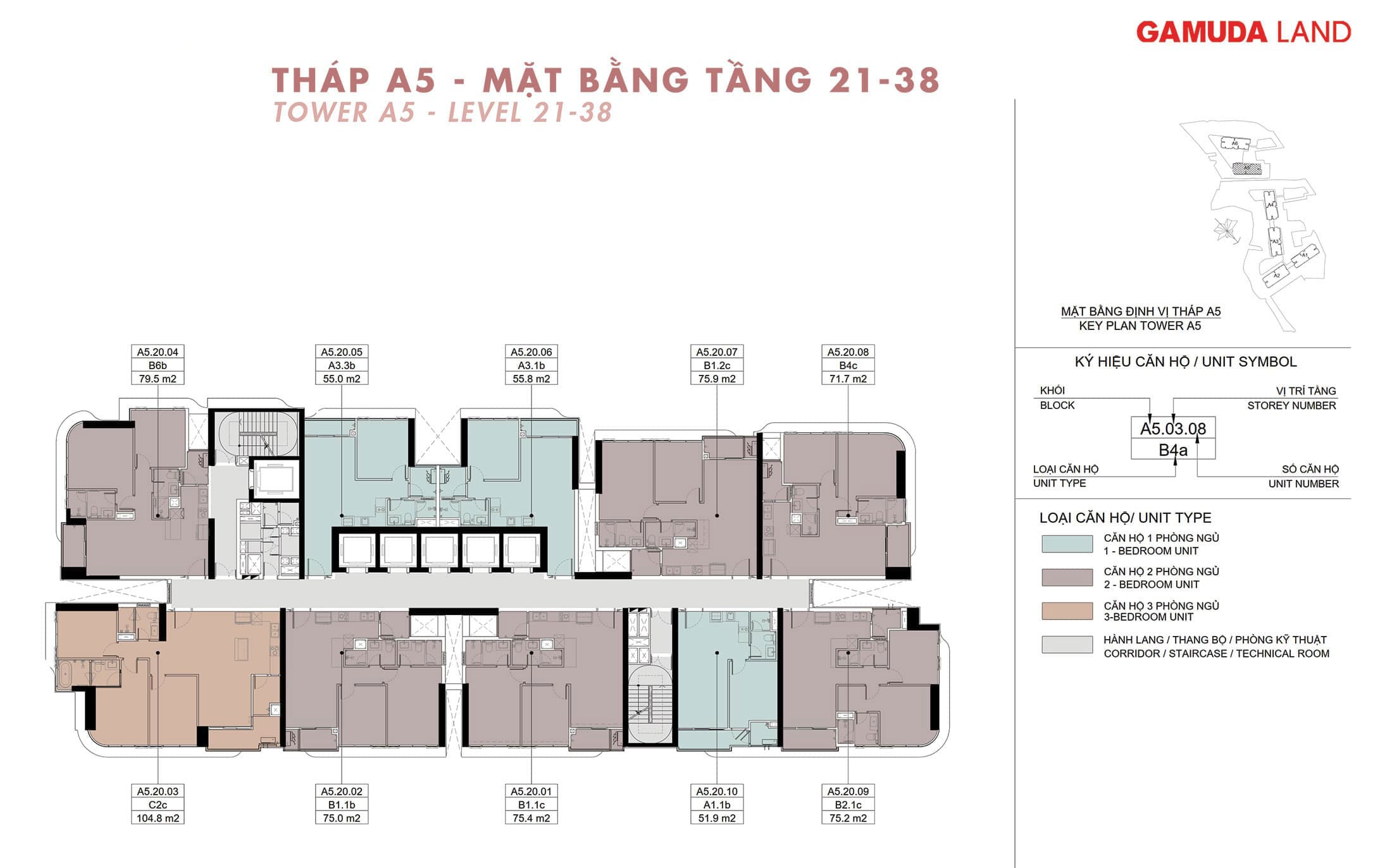 Măt bằng điển hình Tầng 2, Tòa Tháp A5 tại dự án The Ambience Gamuda Land.